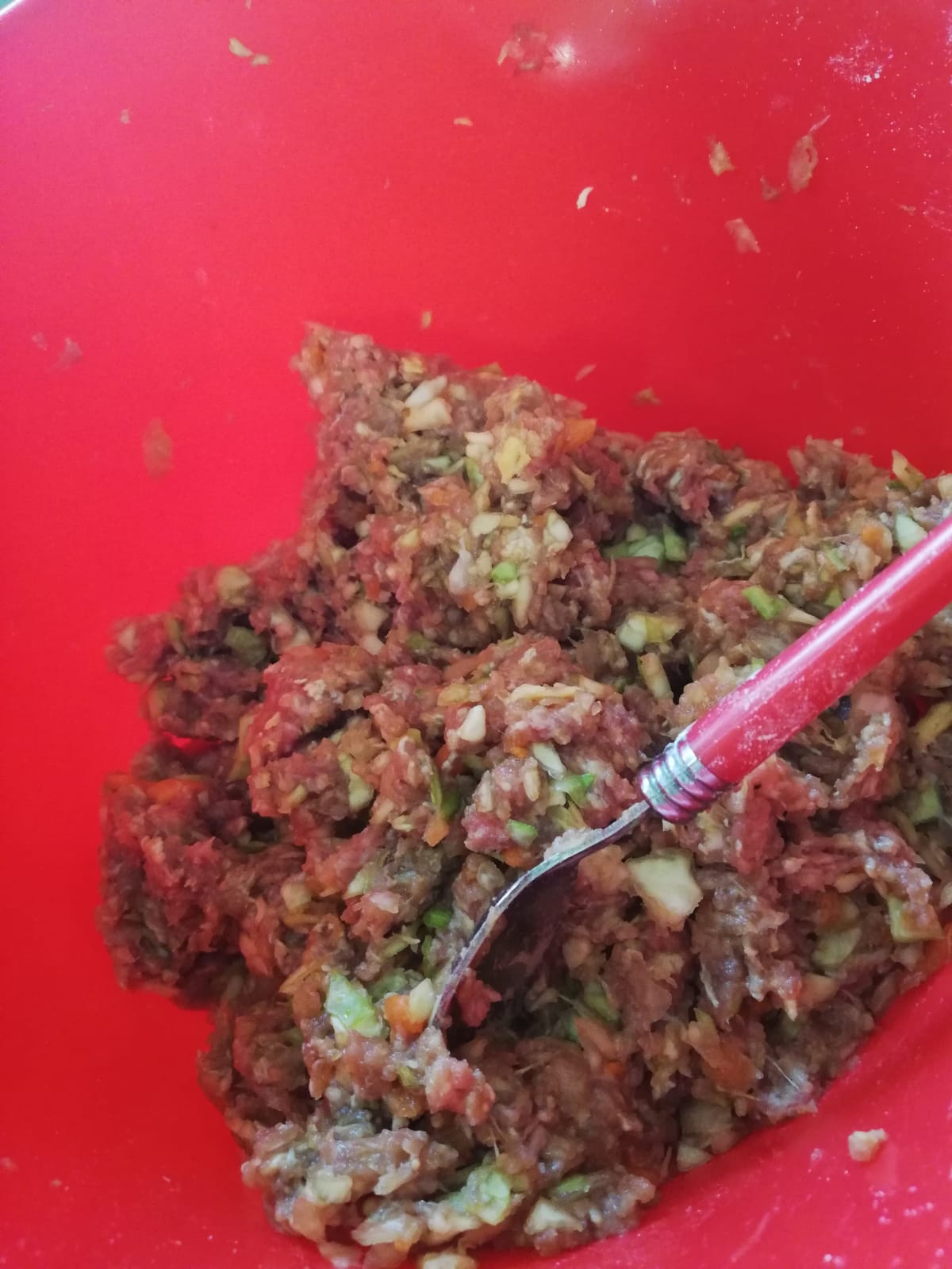 2. Preparem el faciment: Trinxem totes les verdures molt petites, mesclem tots els ingredients.