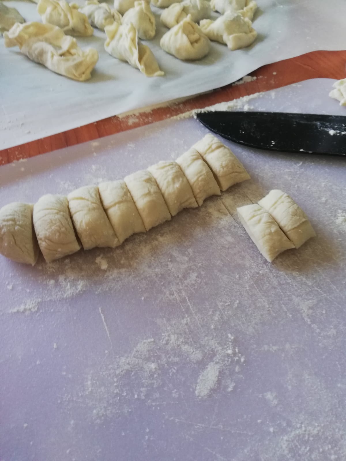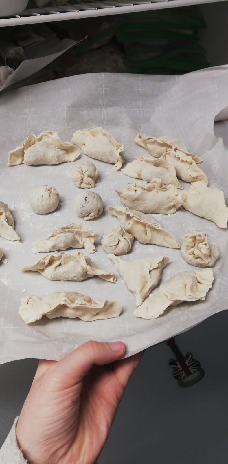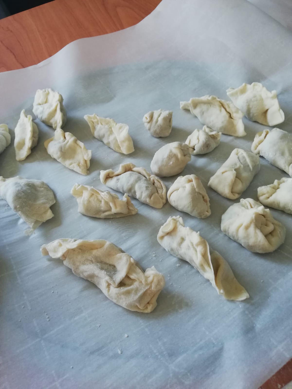 4. Omplir la massa: posem una cullerada petita de massa al centre de la massa i la dobleguem. Evidentment, és més dificil del que sembla a la imatge que veieu a continuació, però em sembla força explicativa. També hi ha altres formes diferents de doblegar-les, vam provar de fer algunes en forma de boleta, i formes diferents. Mentre el farcit quedi dins, i la massa fora, podeu ser creatius!