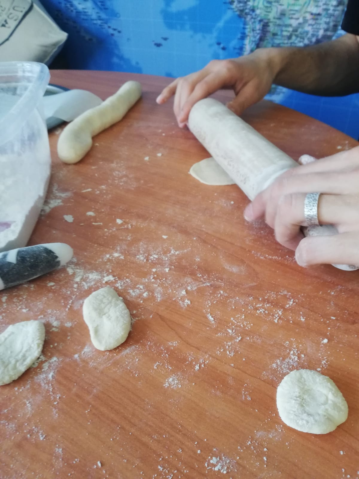 3. Quan hagin passat els 30 minuts per a la massa, li fem un forat el mig i estirem com si fos un dònut gegant. Tallem els dos extrems i obtindrem "xurritos". Aquests, els nem estirant, sempre en la mateixa direcció, fins que siguin finets (que els poguem rodejar amb els dits). Tallem aquests "xurritos" en rodanxes d'un dit d'ample, aquestes rodanxes les aixafem amb la mà, que quedin com "galetes". Amb un rodet, estirem fins que quedi el més fi possible. Podem ajudar-nos d'una mica de farina perquè no s'enganxi a la taula o al rodet.