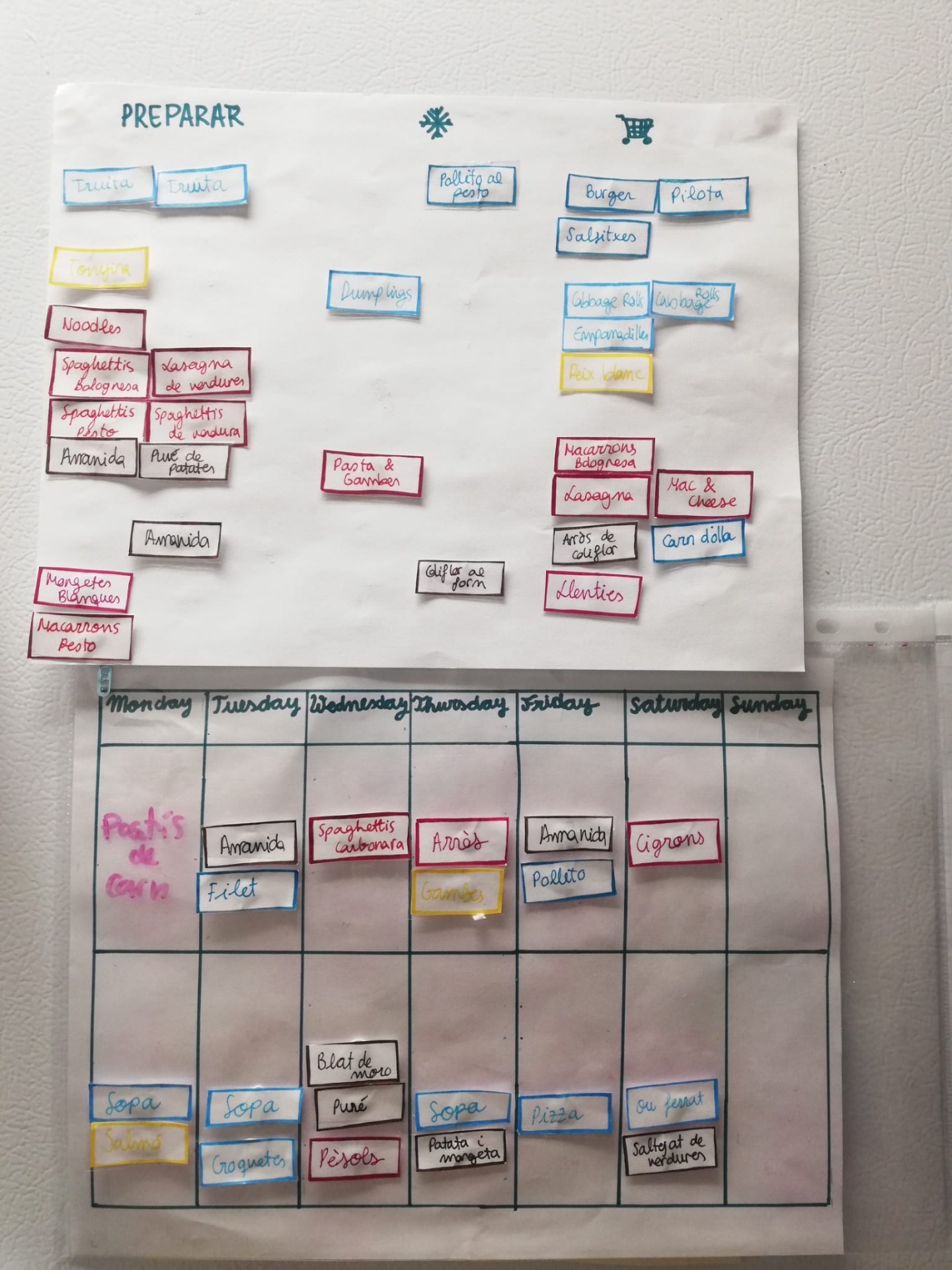 Donat la nostra situació (no tenim cotxe), hem d'anar al supermercat en autobús o demanar la compra per emportar, això ens fa necessari organitzar-nos per comprar un cop per setmana i no deixar-nos res. A més, mengem tots els dies a casa o alguns dies de tupper a fora però també havent-lo cuinat nosaltres. Això ens porta a crear el nostre menú per tota la setmana els diumenges, per fer-ho, tenim una serie de "tarjetes" amb diferents idees que enganxem sobre el menú amb bluetack, si tenim una idea nova que no està a cap tarjeta, l'escribim amb retolador. Us ilustro: