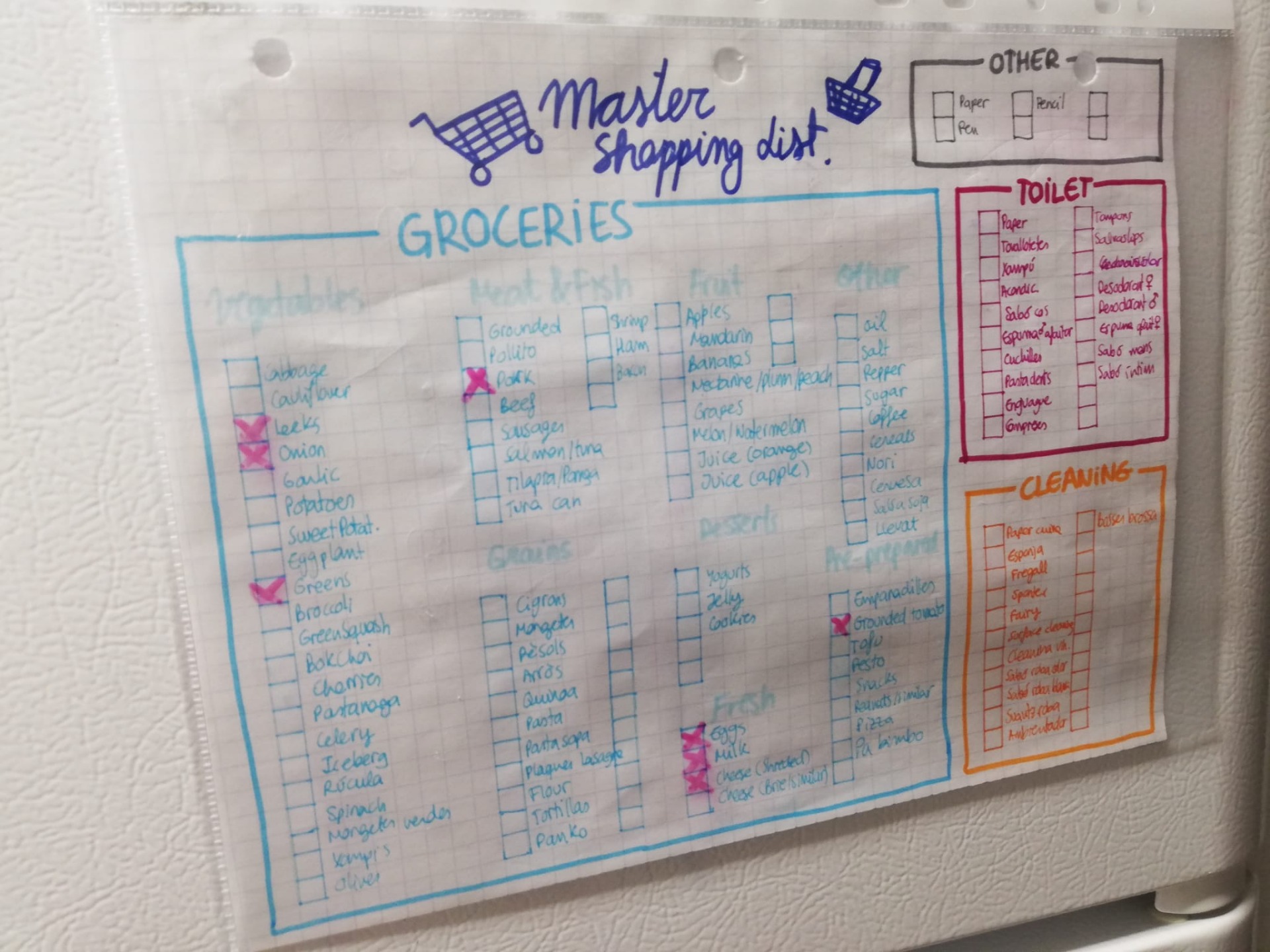 Aquesta llista de la compra, l'hem realitzat després de unes quantes setmanes de comprar, hi ha tots els productes que comprem normalment, quan un producte falta, només hem fe fer una creueta al quadrat. Quan hem d'anar a comprar, fem una foto a la llista i quan tornem, esborrar les creuetes. Per això esta el full dins d'una funda de plàstic, així podem escriure amb retolador de pissarra a sobre i esborrar quan vulguem.