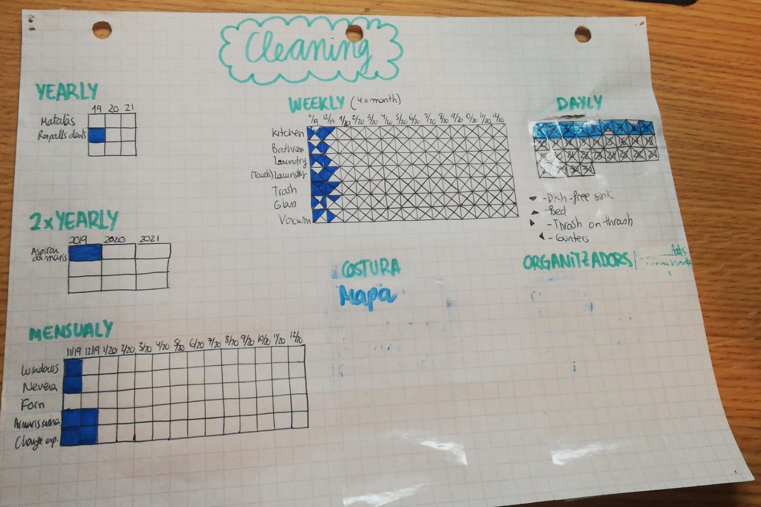 Les tasques estan organitzades segons la seva periodicitat. Anualment hem de girar el matalàs i comprar un nou paquet de respalls de dents. 2 cops l'any aspirar el matalàs. 1 cop al mes netejar les finestres, la nevera, el forn, els armaris de la cuina i canviar les vaietes. 4 cops al mes (o setmanalment), fer la cuina, el bany, la bugada dues vegades, tirar el reciclatge, rentar els vidres i passar l'aspiradora. Pel que fa a les tasques diaries, hem posat un tros de celo gran a sobre dels dies, de manera que podem pintar amb retolador de pissarra i quan el mes s'acaba, esborrar i tornar a començar. Hem fet el mateix pel que fa a les tasques de costura o als organitzadors que hem de fer (m'agrada fabricar-los a mi, crec que és més barat i personalitzable).