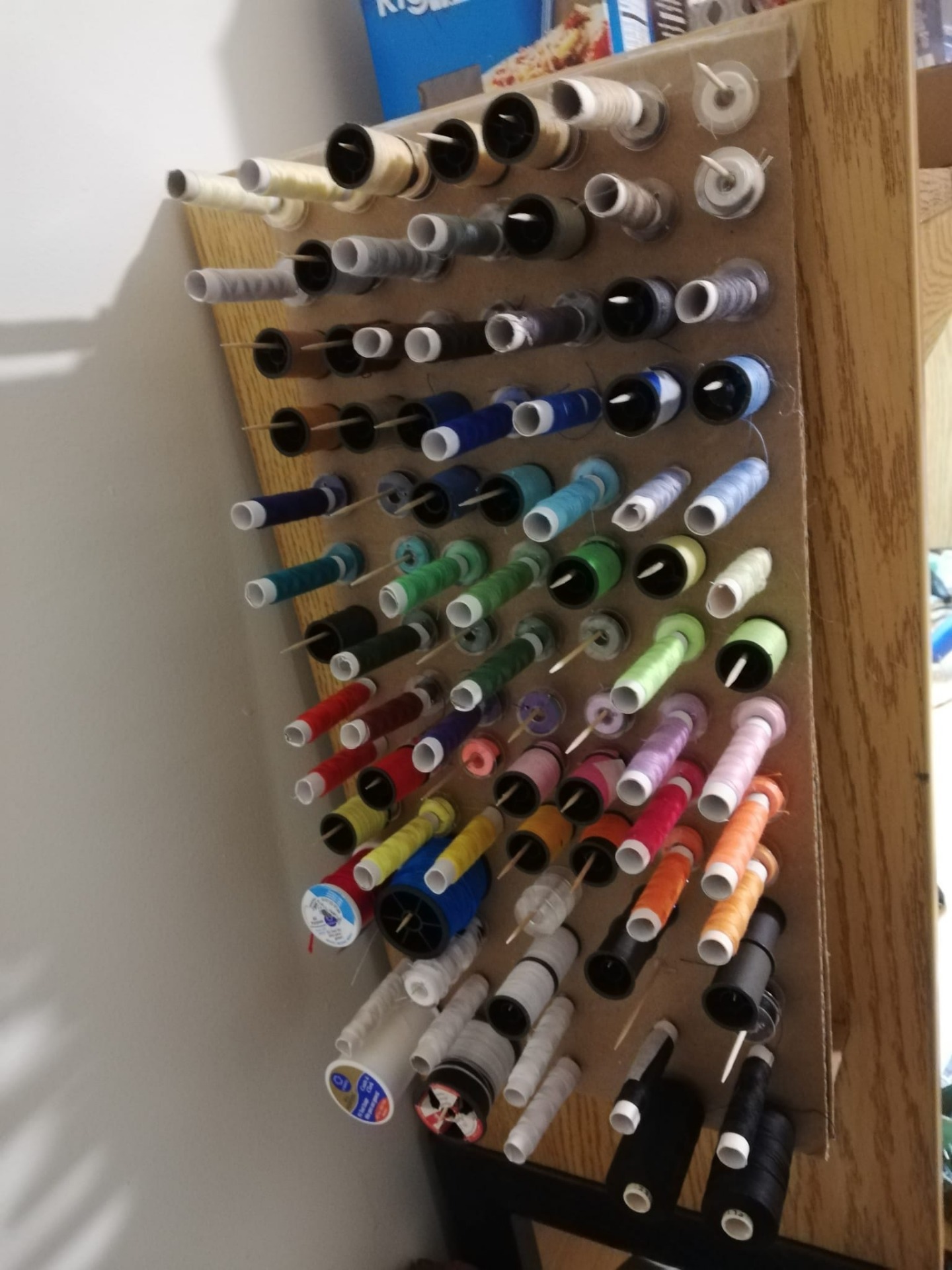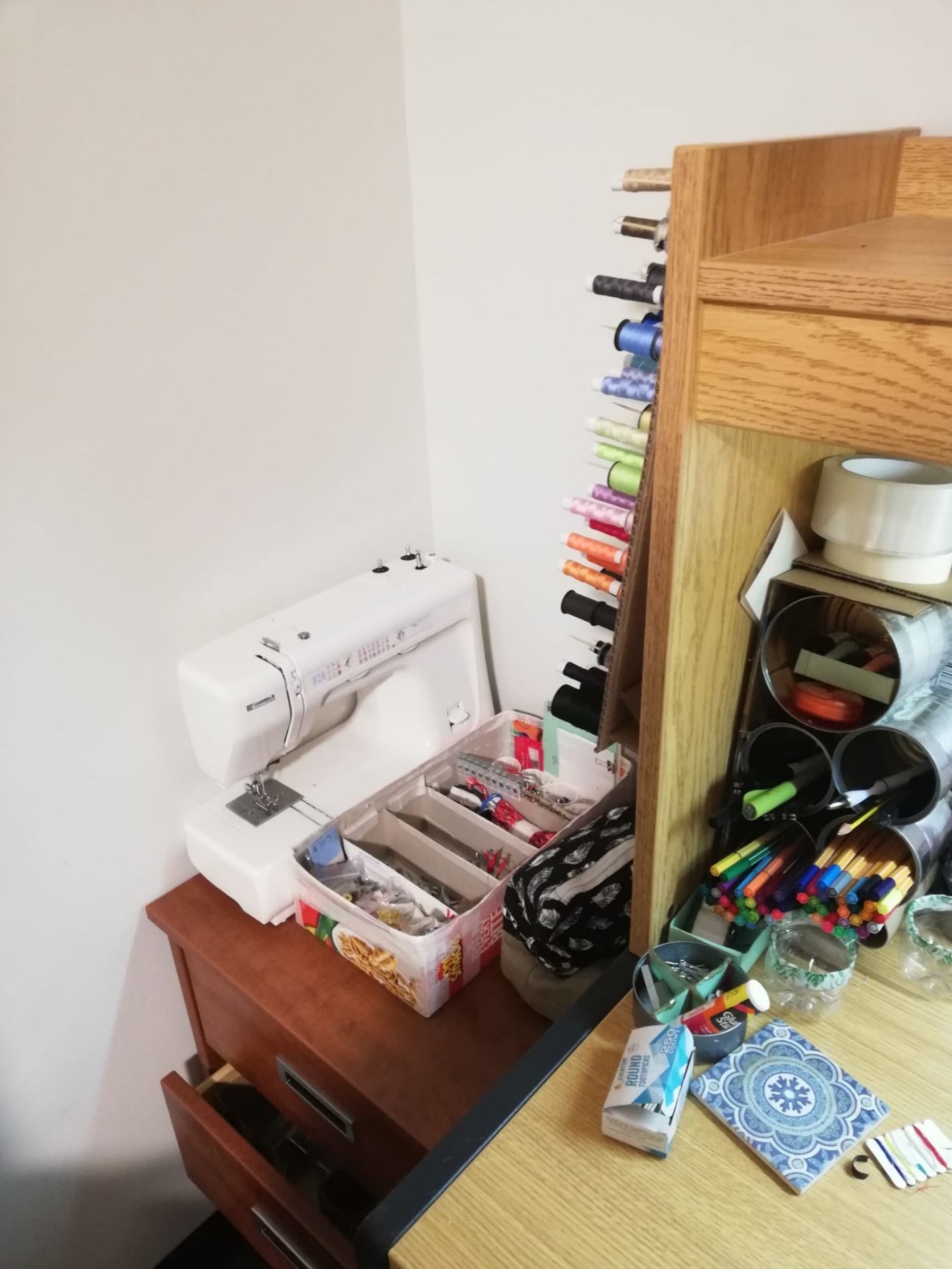 Arribem a un dels meus punts preferits. A mi m'agrada molt cosir, fabricar coses noves, inventar-me les mides d'un estoig i que surti bé, etc. Per tant, em calia un espai on deixar tots els meus estris. Volia que fos un espai fàcil de manipular, en qualsevol moment puc agafar la meva maquina, escollir quin fil és el més adient i posar-me a cosir, i quan acabo és ràpid d'endreçar. Aquest és el resultat: